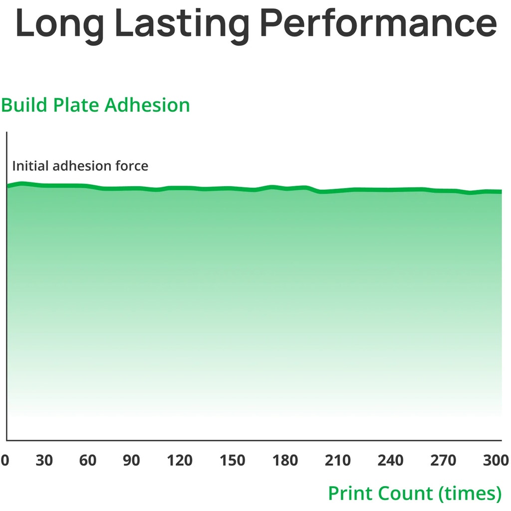 The robust SuperTack coating remains reliably adhesive even after intensive use. With less than 20% loss of adhesion after 300 print runs, the Cool Plate offers an impressive service life.