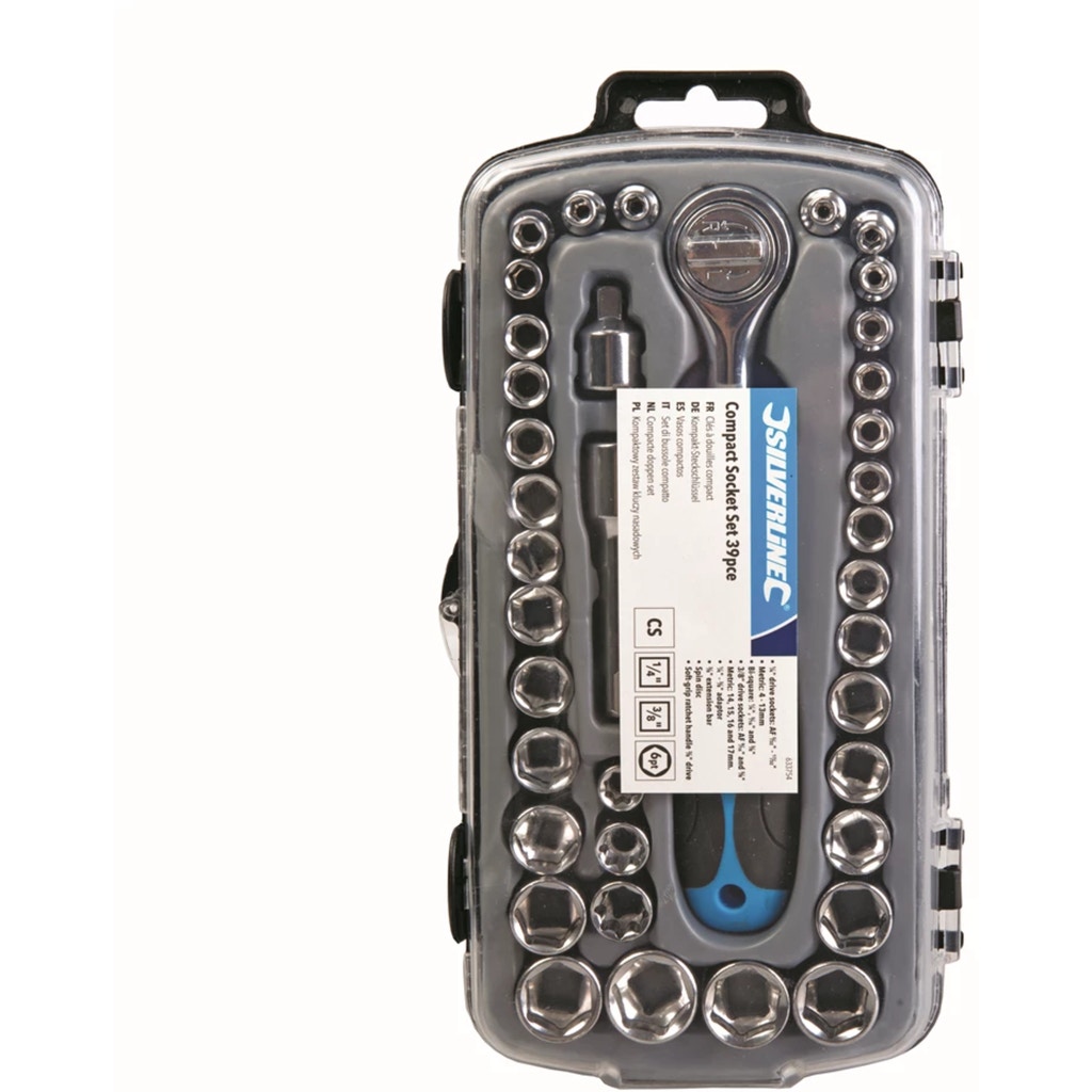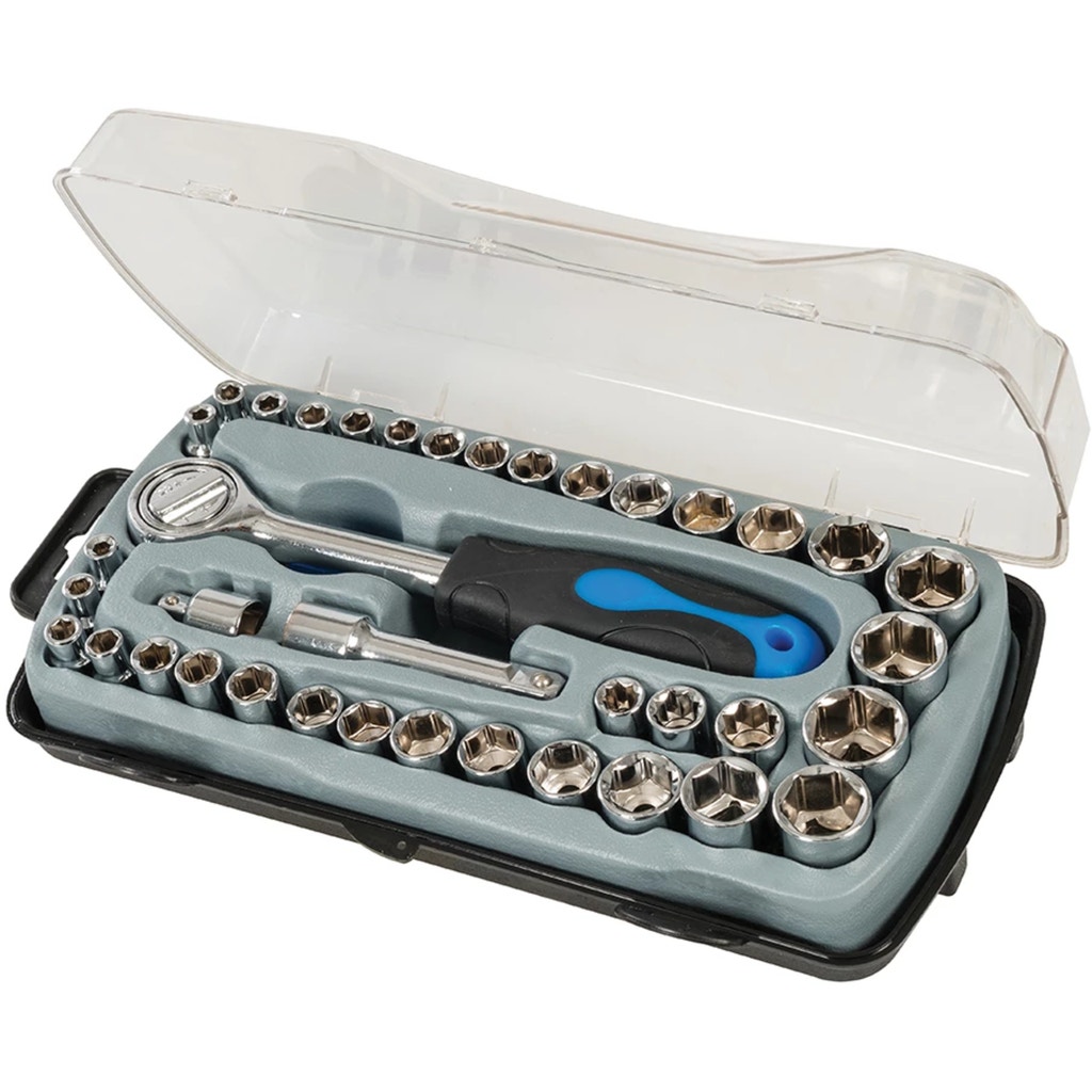 This set includes chrome plated AF and metric socket wrenches with 1/4" and 3/8" drive. Includes adapter, extension, turntable and ratchet handle in a handy storage box.