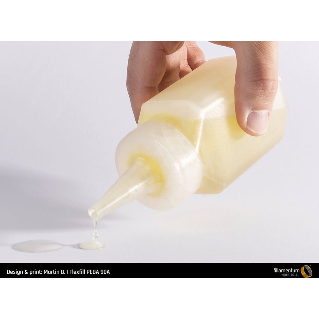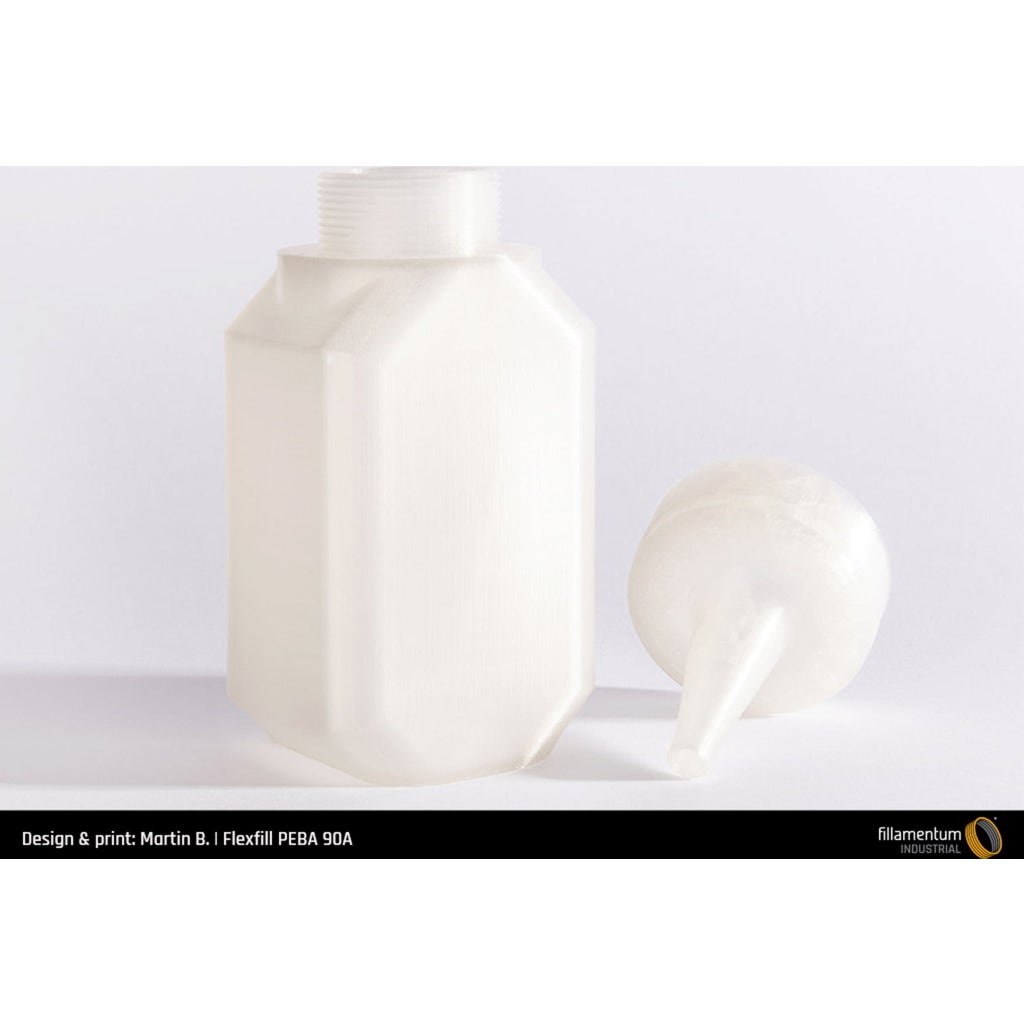 This type of Flexfill is based on polyether block amide (PEBA), which was specially developed for processing in 3D printing. Although it is flexible with a Shore hardness of 90A, it shows a different thermal, mechanical and chemical behaviour than other Flexfill filaments (TPU, TPE).