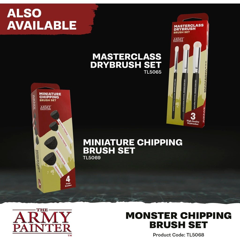 The Army Painter Monster Chipping Brush Set is the ultimate tool for creating realistic weathering and wear effects on landscapes/terrain and large miniatures. With these extra-large brushes, you can effortlessly achieve scratches, chipped paint, and worn surfaces that give your models an authentic used look.