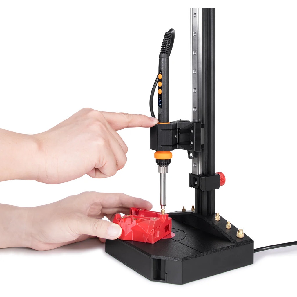The powerful 90 W soldering iron heats up quickly and maintains a stable temperature. A digital real-time display ensures precise control, providing optimal embedding conditions for a wide range of filament types.