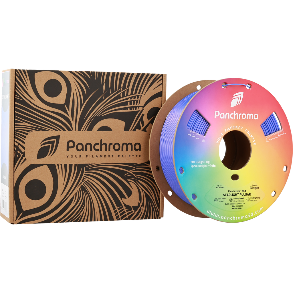 Bring a whole new brilliance to your 3D prints with Panchroma™ Starlight PLA by Polymaker. This special filament creates a shimmering effect that changes colour with the light, giving each model a dynamic, eye-catching finish ¨C reminiscent of stars twinkling in the night sky.