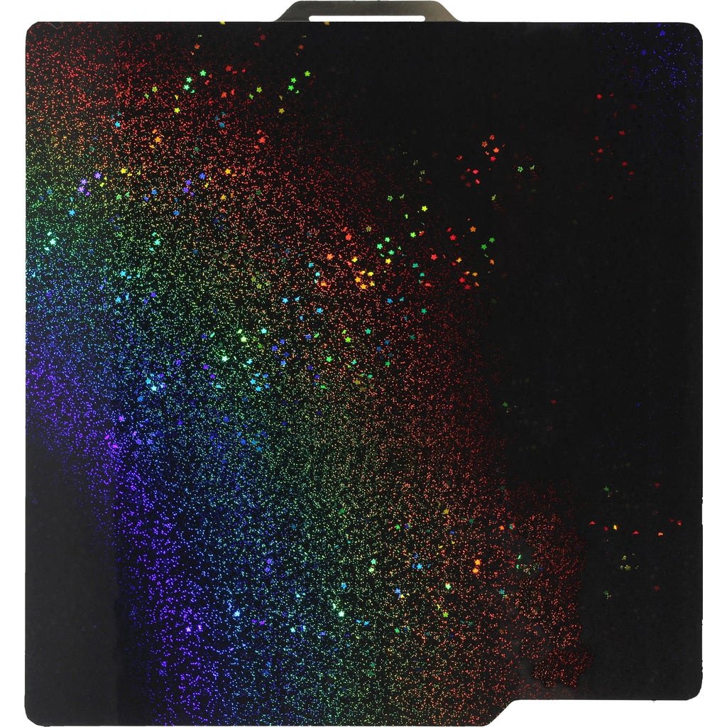 The Magic PET/PEI Build Plate by 3DJAKE is a flexible, double-sided coated build plate with a magnetic base. One side of the build plate is made of PET material with a shimmering rainbow pattern, which gives the printed objects unique visual effects. The other side has a powder-coated PEI layer for excellent adhesion and easy removal of the models.