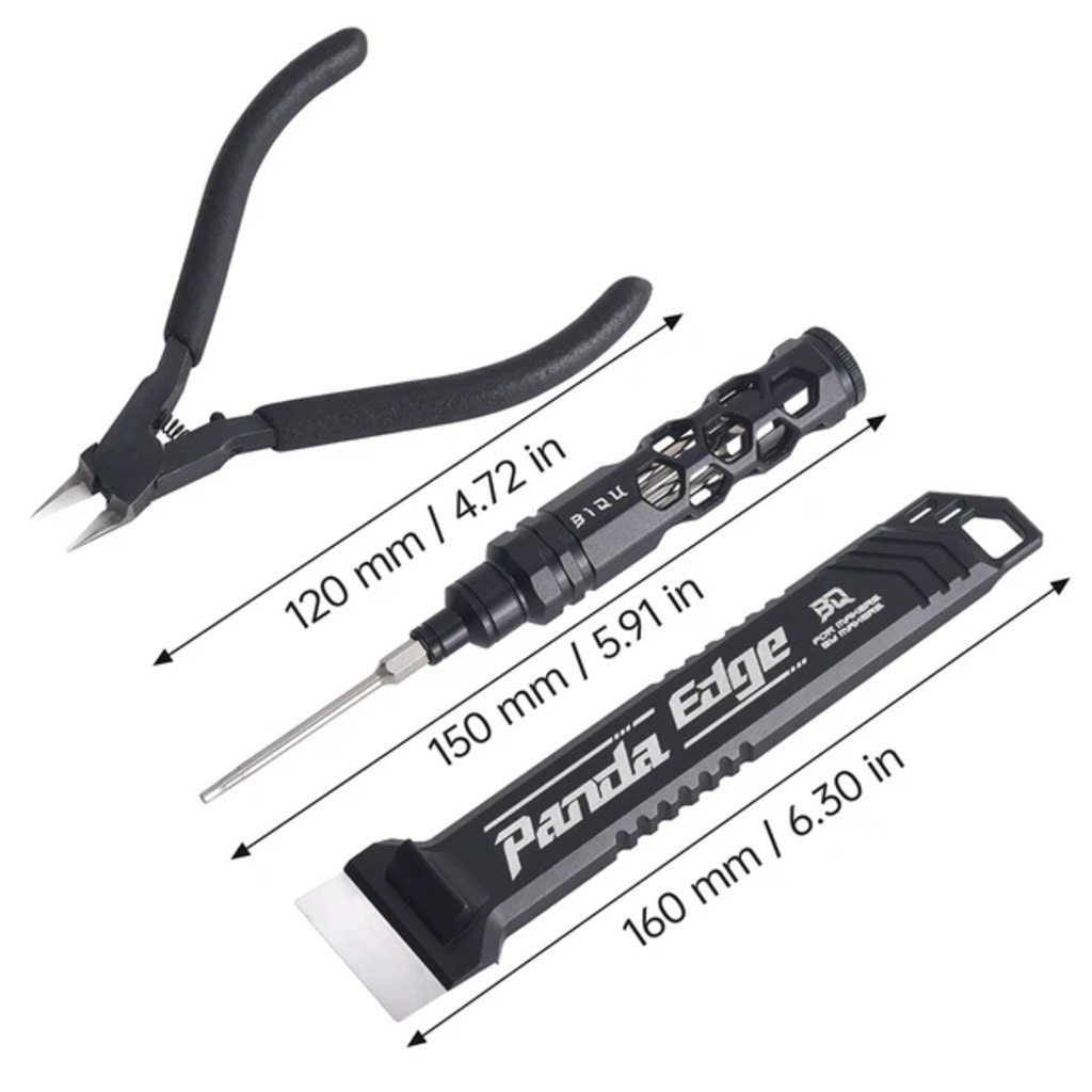 The kit includes a 5-in-1 multi-function screwdriver (with PH0 and hexagon socket H1.5 to H3.0) as well as razor-sharp, precision-ground blades (cutter) and an edge spatula. The set offers total control and enables flawless, clean cuts and damage-free removal of prints.