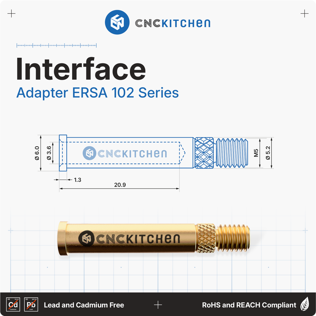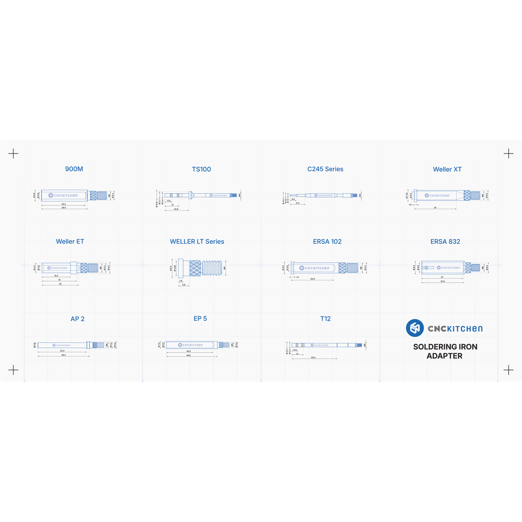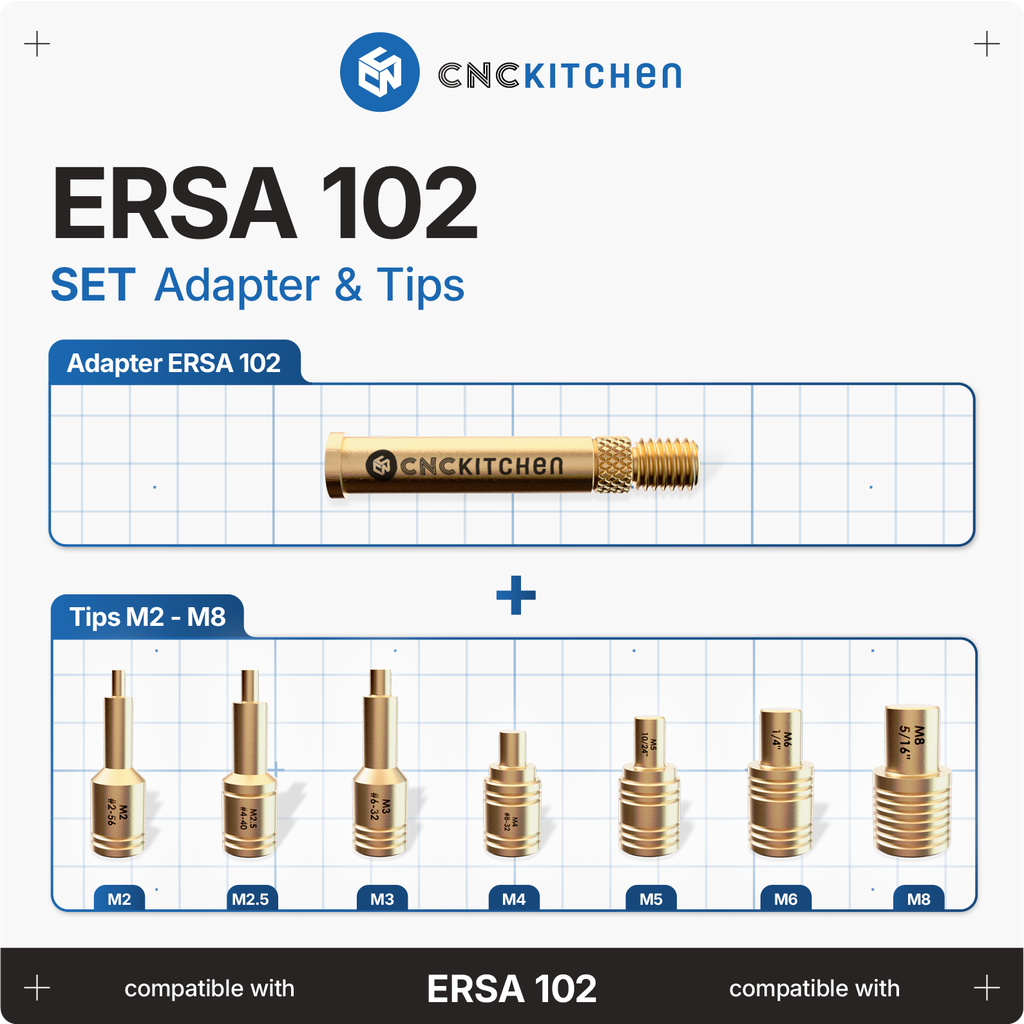 The soldering tips are compatible with ERSA i-Tool, i-Tool Nano, and i-Tool Pico soldering irons and are perfectly matched to CNC Kitchen threaded inserts. They feature laser markings and notches for easy size identification. REACH-compliant.