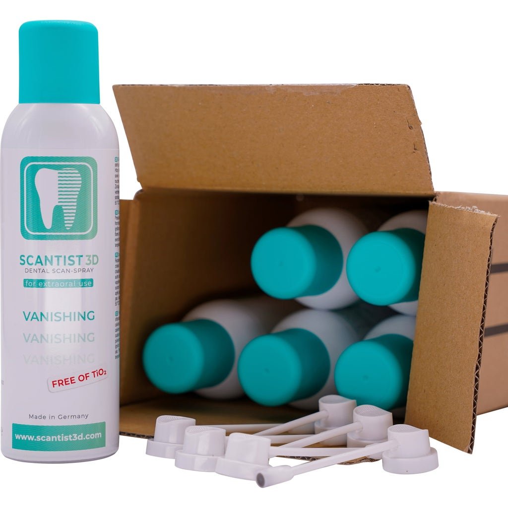 SCANTIST 3D Vanishing Spray is an extraoral scan spray for use in the dental field, which is used to optimise the scanning quality for CAD / CAM, camera/video recordings, structured light scans, blue light scans, etc.