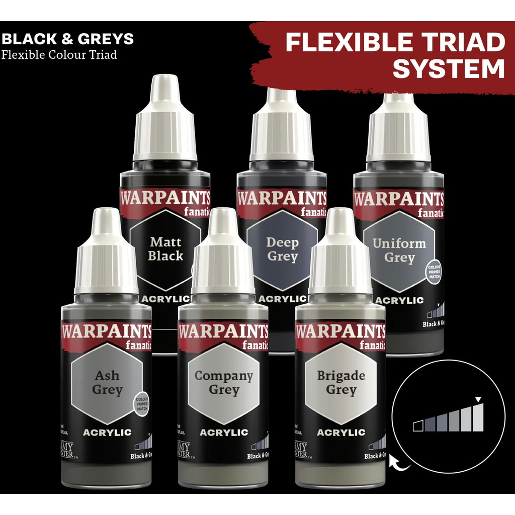 Dive into the depths of black and grey! The Army Painter's Warpaints Fanatic: Black & Greys offers you a carefully curated colour palette of highly pigmented acrylic paints that will give your miniatures a dark and atmospheric look with excellent opacity.